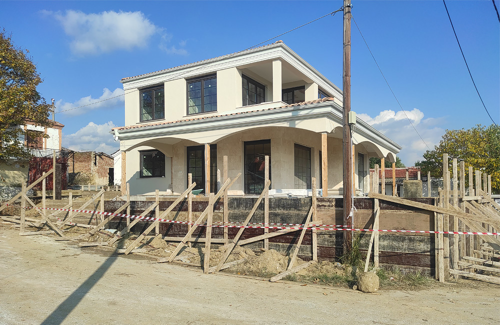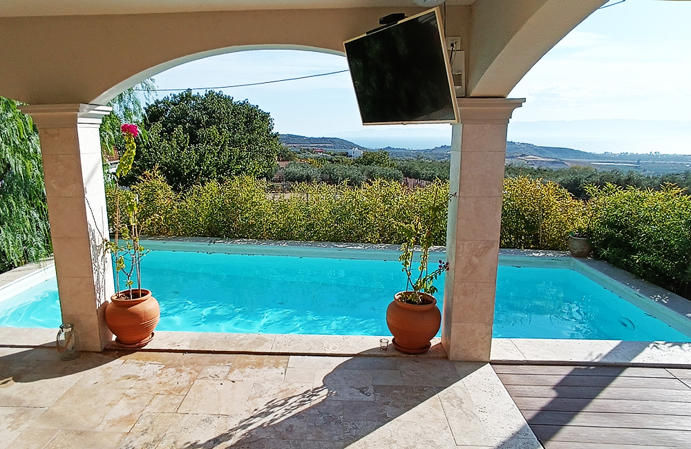 A detached super lux house which is built with a concrete foundation and then two of its floors with a wooden construction. It has a very special garden with lawn, exotic trees and a state-of-the-art heated swimming pool, a small palace with great views.